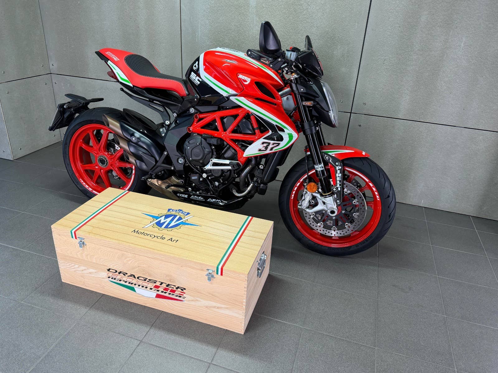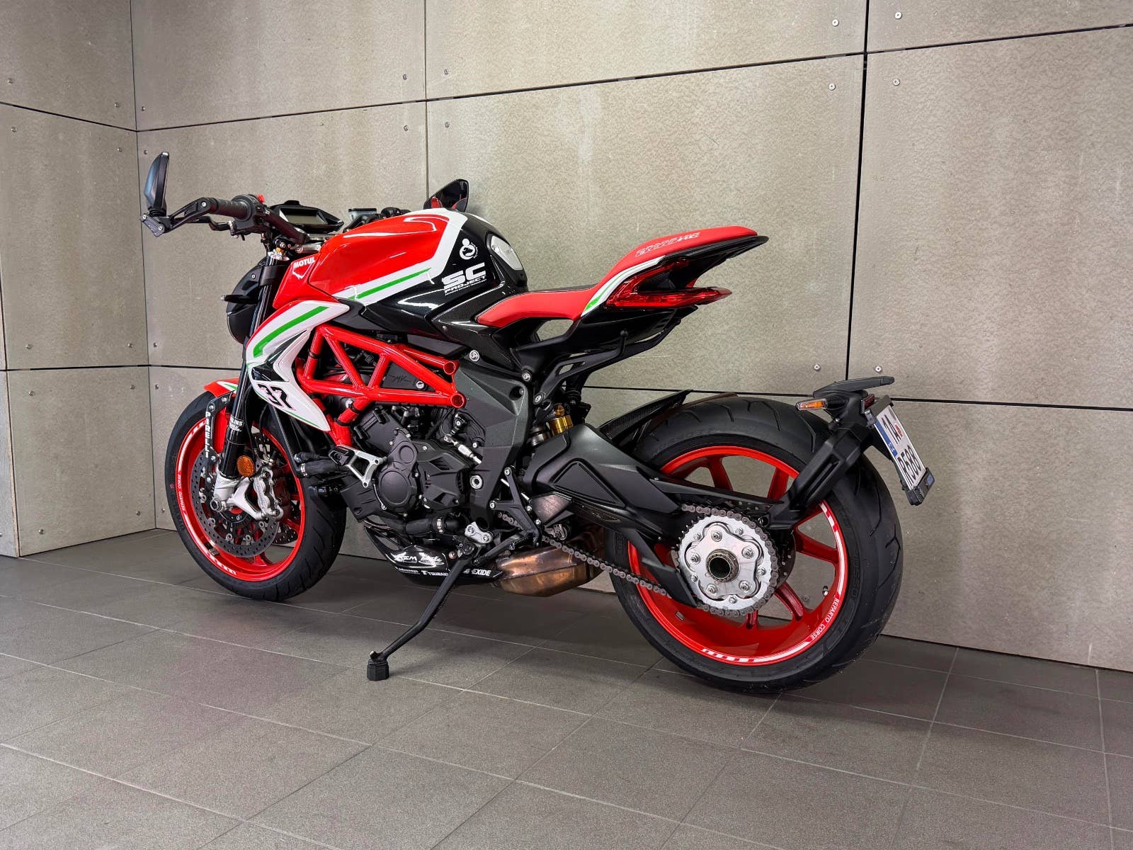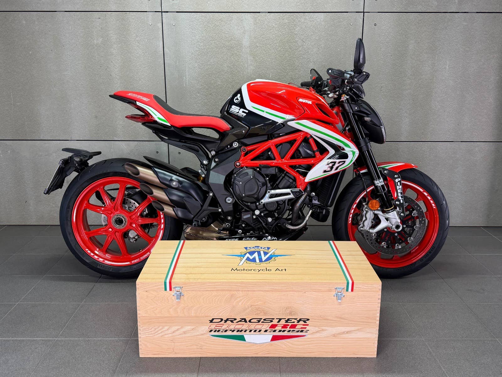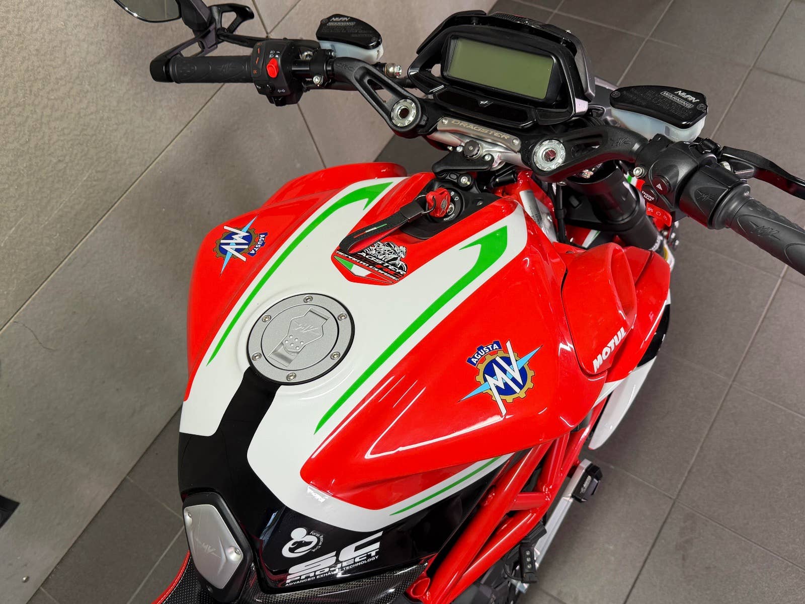 MV Agusta Dragster 800 Reparto Corse s podvozkem ÖHLINS v limitované edici. K motocyklu je dodáván box s plachtou, otevřeným titanovým výfukem SC Project a jednotkou. K motocyklu je i originální koberec na vystavení (poslední 3 roky strávil u sběratele). Na motocyklu je navíc velice výkonný plně nastavitelný podvozek ÖHLINS. Mnoho karbonových dílů, tlumič řízení, skládací zpětná zrcátka. K motocykly jsou také certifikáty k vystavení, veškeré brožury a elektronické manuály na speciální ediční kartě, manuály a mnoho dalších věcí. Provedena uplně čerstvá STK. Zeptejte se nás také na možnost výhodných splátek, nově i s nulovou akontací! Schválení trvá 15 minut, a schválení můžeme vyřidit i po telefonu! K danému motocyklu dostanete voucher na 5000 Kč na další stoje z nabídky motopalace. cz a další slevový voucher do eshopu ACI (vybavení, oblečení, moto-kosmetika)! Rezervujte si svůj motocykl včas! Před návštěvou nás prosím kontaktujte, abychom Vám mohli být k dispozici, snažíme se vyhovět i mimo pracovní dobu (večery, víkendy i svátky). Těšíme se na Vás!